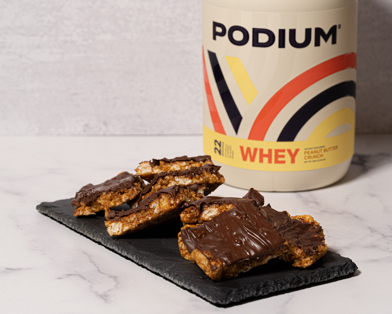 As we transition into the new year, we're sure that many of you have made some health related resolutions for 2023. That's why we're bringing you all the delicious AND nutritious snacks, starting with these phenomenal Peanut Butter Chocolate Rice Cake Bars. This recipe features PODIUM Whey Peanut Butter Crunch, which means it truly is as delicious as is is nutritious. High in protein and made with love, these are your new go-to pre/post workout snack!